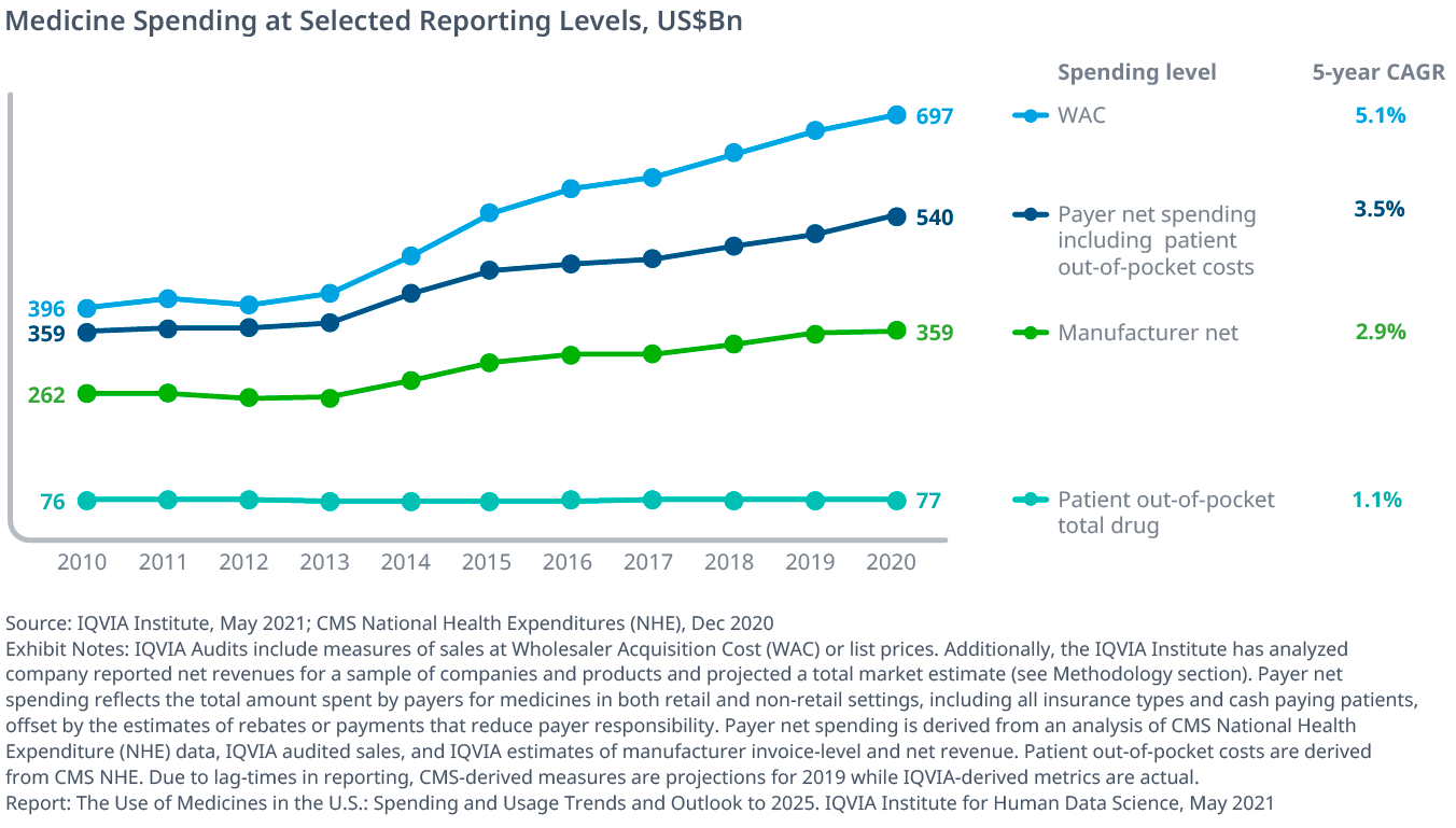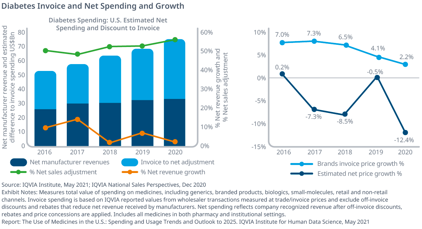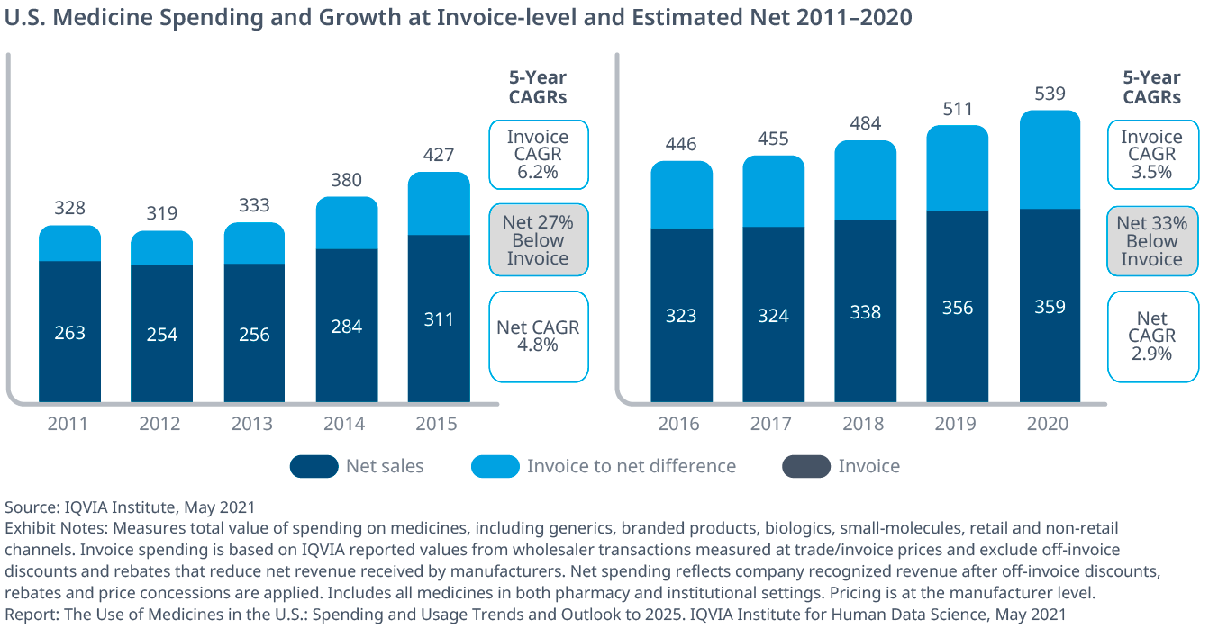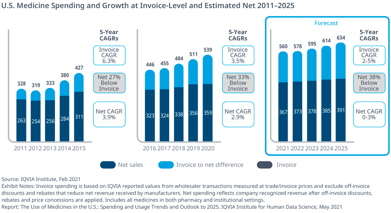 Exhibit 49: U.S. Medicine Spending and Growth at Invoice-level and Estimated Net 2011–2025