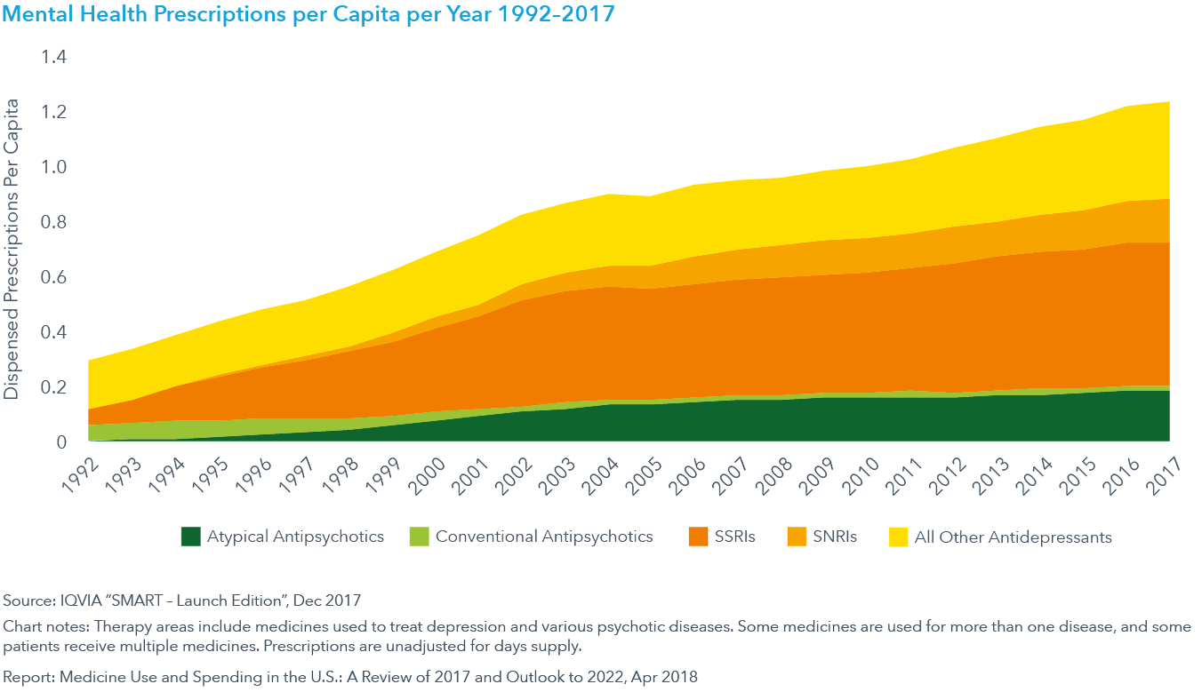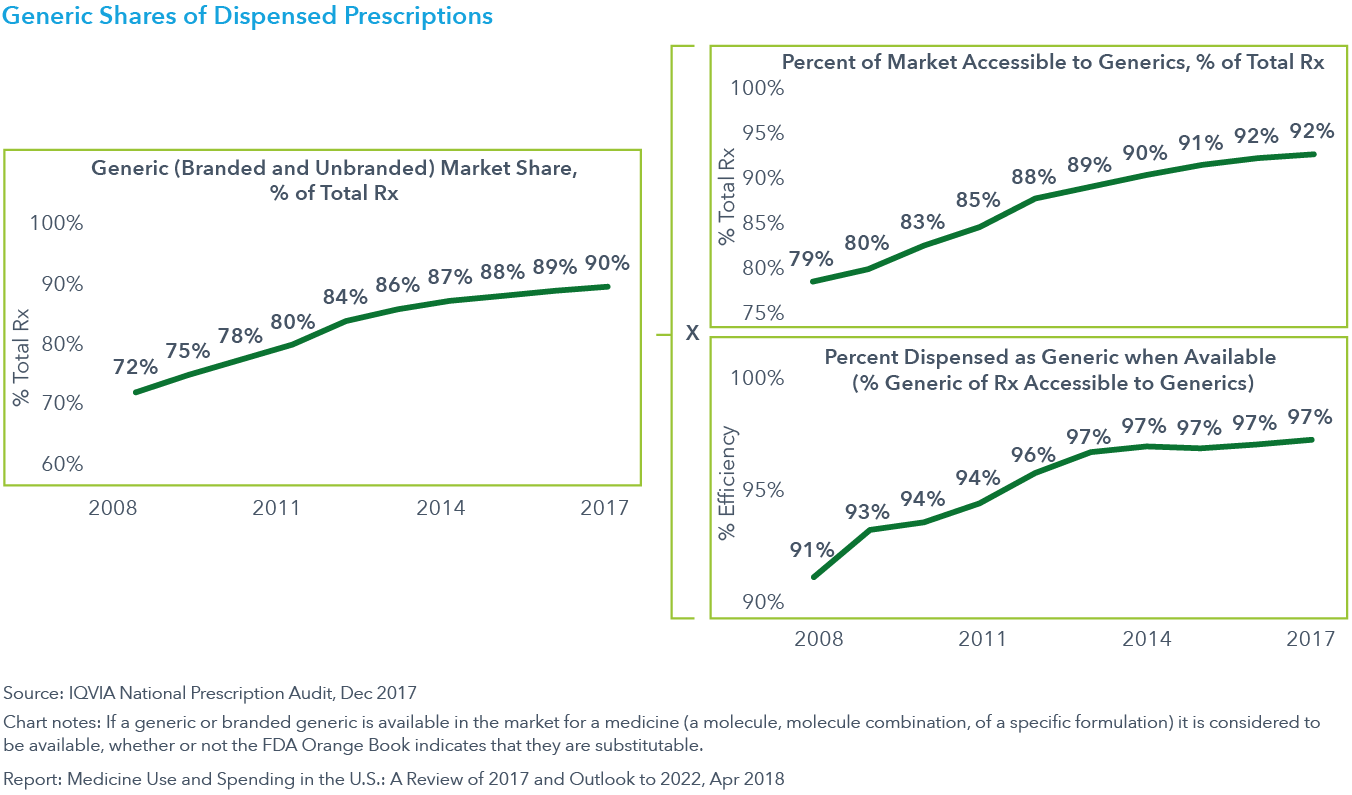 The outlook to 2022 is for 2–5% net spending growth, with 1–4% growth in retail and mail-order prescription drugs. This growth, driven primarily by the large number of new medicines, many of which will be specialty and orphan drugs, will be offset by the impact of losses of brand exclusivity.