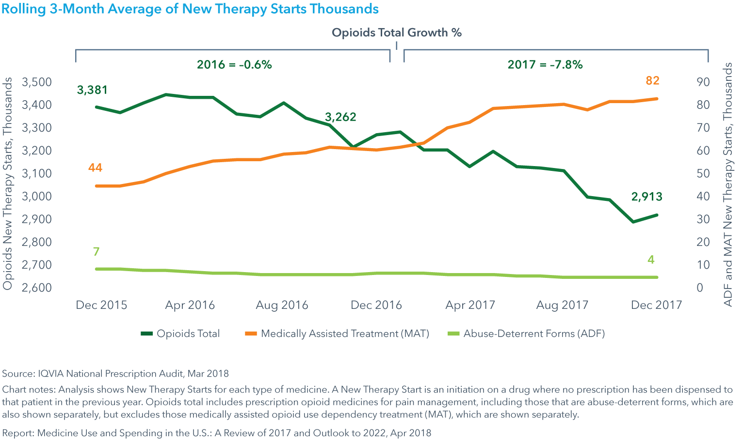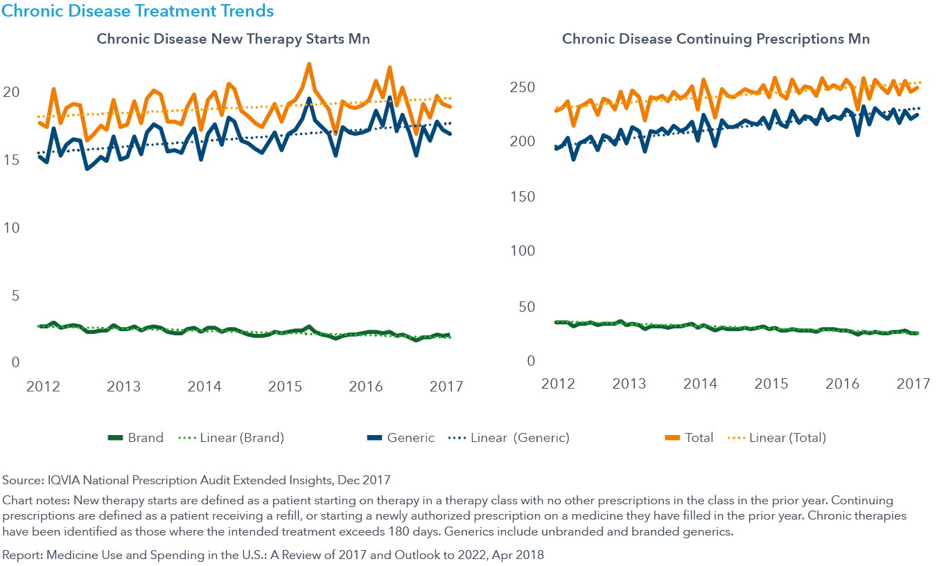 Medicine use by patients has continued to rise. In 2017, there was a significant increase in chronic, 90-day prescriptions which can be linked to efforts to improve adherence. Of note, the greatest decline in treatment volumes in 2017 was for prescription opioids; the highest doses of prescription opioids declined by over 33% during the past two years.