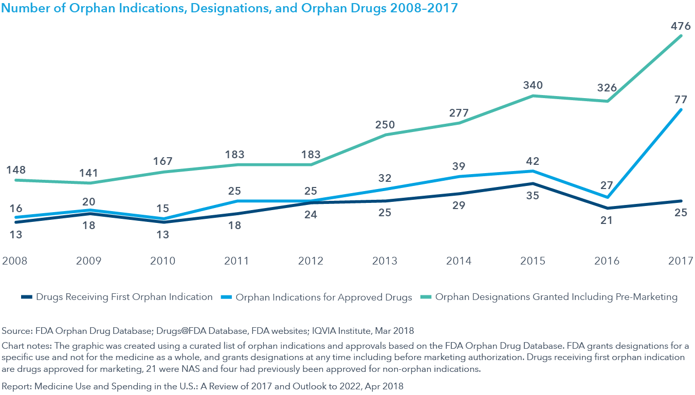 New drug launches more than doubled in 2017 from 2016. Forty-two new active substances (NAS) were launched, with 21 for rare diseases and 14 in cancer. Significant shifts in the regulatory process are becoming apparent, as 19 drugs received a breakthrough designation and 18 included patient-reported outcomes as part of their approved label from FDA.