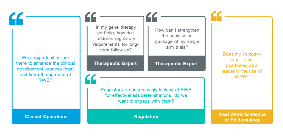 Figure 1 shows a set of questions that may arise when dealing with RWE-related business challenges, and that could indicate that the company is ready to explore the use of RWE in regulatory submissions. These questions may come from a therapy lead who is wondering how to address post-approval long-term follow-up requirements for gene therapies, or looking for ways to strengthen the submission package of a single-arm trial. In some cases, the clinical operations leadership is seeking to drive cost and time efficiencies through use of RWE.