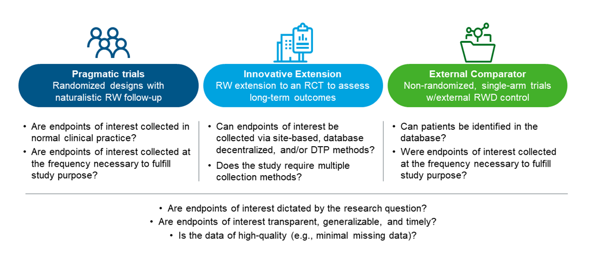 Figure 3 provides some questions about endpoints to assess feasibility before implementing any of these RWE-RCT designs.